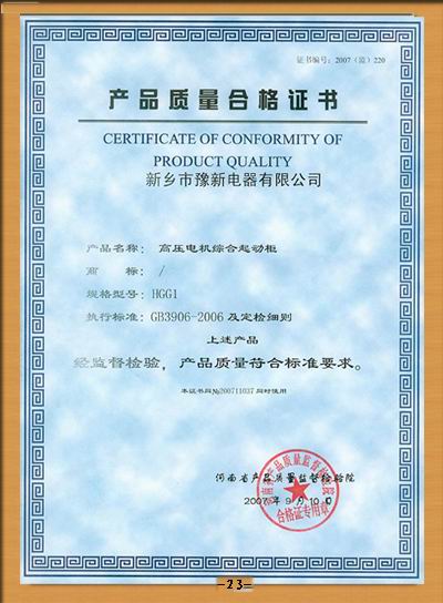 高壓綜合啟動(dòng)柜產(chǎn)品質(zhì)量合格證書
