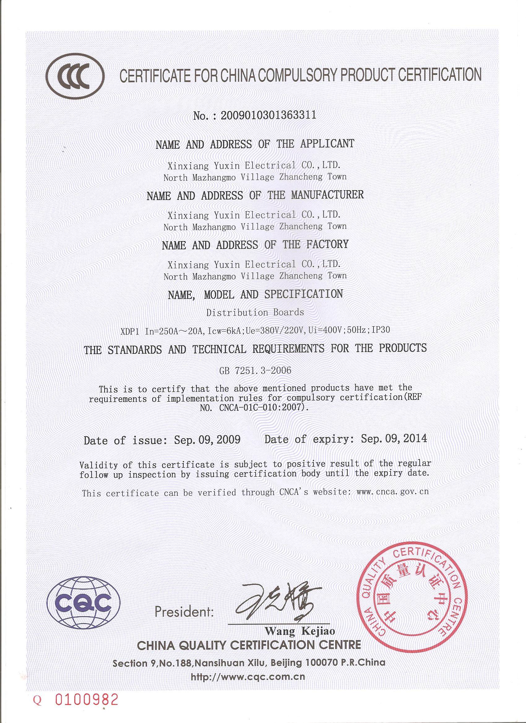 XDP1-250控制箱國家3C認(rèn)證證書{中}
